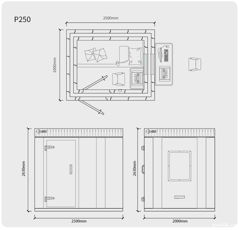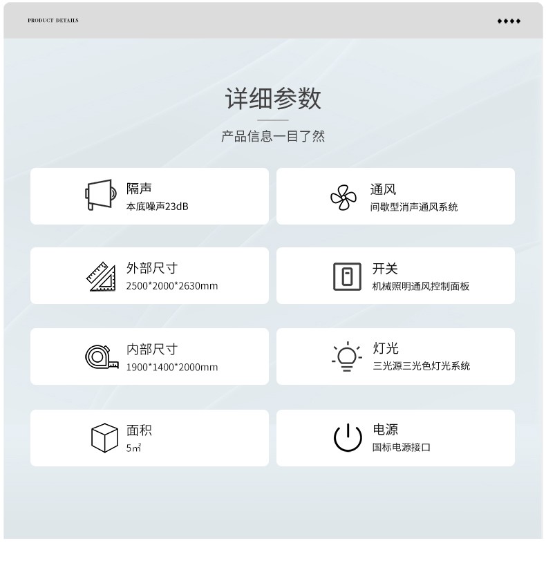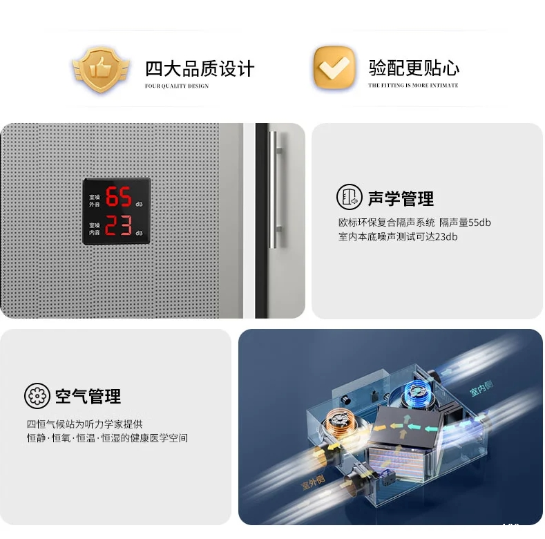 Model:P250 Noise insulation:outdoor ambient noise ≤55dB (A), indoor background noise ≤20dB (A) Environmental protection:Formaldehyde release ≤0.4mg/L,meeting《Indoor decorating and refurbishing materials—Limit of formaldehyde emission of wood-based panels and finishing products》 Reference standard:JJF 1191-2019 《Calibration Specification for Acoustic Performance of Audiometry Rooms》 GB 3096-2022 《Environmental quality standards for noise》 GB 50325-2020 《Standard for indoor environmental pollution control of civil building engineering》 Applications:ABR testing, OAE testing