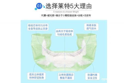 优势:双层立体防漏护围、U型立体裤边、尿显提示功能、布纹腰能多次粘贴、更超薄锁水反复吸收、价格适中、异味分子祛味锁水 适用人群:产妇、经期妇女、医院手术、婴幼期长期卧床病人、失禁患者