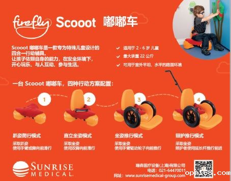 一款特殊儿童四合一行动辅具产品,赋予特殊儿童自主行动力,让他们凭借自身的能力去玩乐,去探索,去参与。一台Scooot嘟嘟车有四种行动方案配置,包括趴姿爬行、直立坐姿、坐姿推行、照护推行。可用于室外平坦、水平的路面环境。适用于2-6岁儿童,最大承重22公斤。
