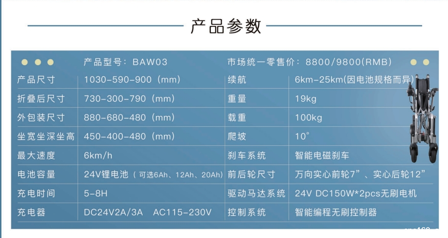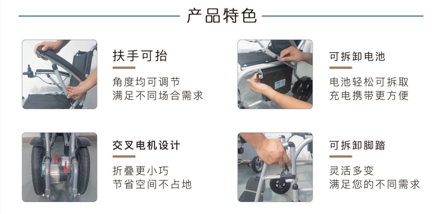 1、铝合金车身,净重17公斤 2、快拆式脚踏,方便上下车、移位 3、收合简单,免弯腰,可放后备箱 4、专利防后倾轮,二段式设计,有效防止倾倒、后翻,安全加倍
