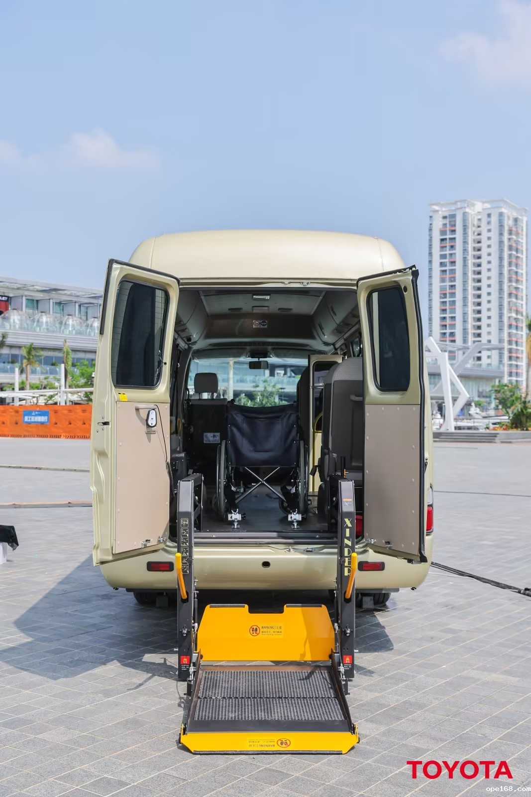轻型客车,汽油(92#),4.0L V6,5挡MT,9座(含驾驶位)正常座位5个,轮椅位4个,车后双开门,搭载国产“信德泰克” 升降平台,轮椅可直接进入车内,车内配有轮椅固定装置轮椅从后方乘车时,升降平台上升需30s;固定轮椅:3min/轮*4 个轮椅=12min。通过升降平台辅助乘车,适用于老年人、轮椅使用人士、残疾人、机构用。