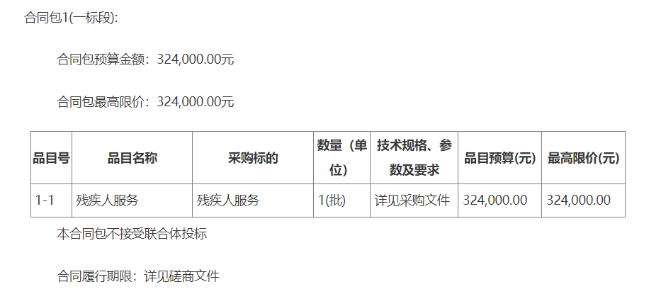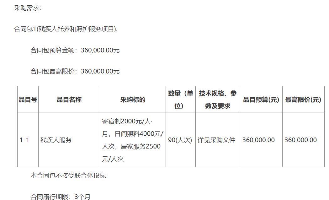 对处于就业年龄段的智力、精神残疾人及重度肢体残疾人进行托养服务,共计274人。对接受托养服务的残疾人提供以生活照料和护理、生活自理能力训练和社会适应能力训练为主,辅之以运动功能训练、职业康复与劳动技能训练等服务。本项目分三个标包(每个供应商可同时投多个标包,但最多只能中一个标包)。A包对处于就业年龄段的重度肢体残疾人进行托养服务,共134人,即20.1万元;B包对处于就业年龄段的精神残疾人进行托养服务,共120人,即18万元;C包对处于就业年龄段的精神残疾人进行托养服务,共20人,即3万元。